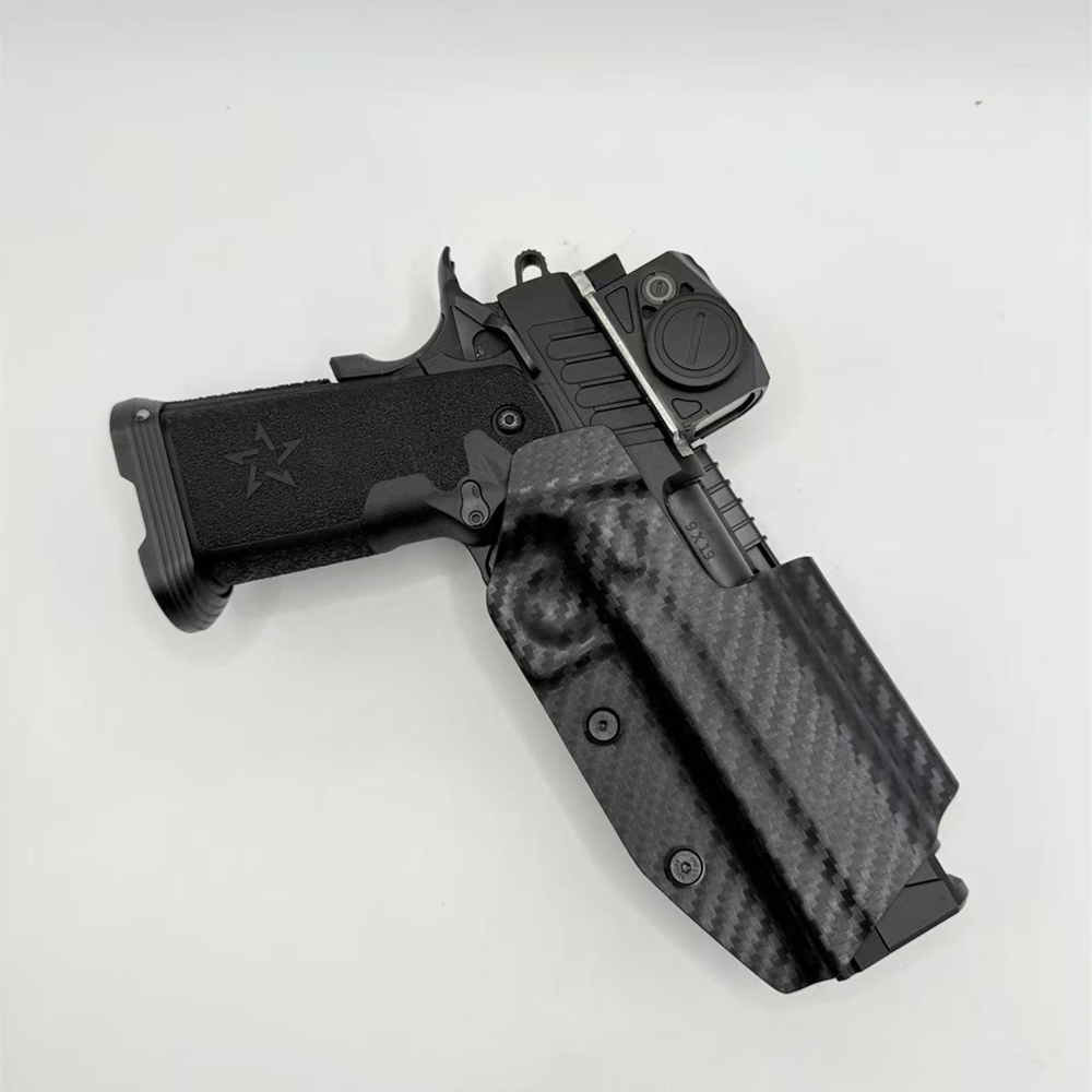 采用美国进口优质kydex板材,利用压缩模具一体成型,手枪与枪套之间完美衔接。